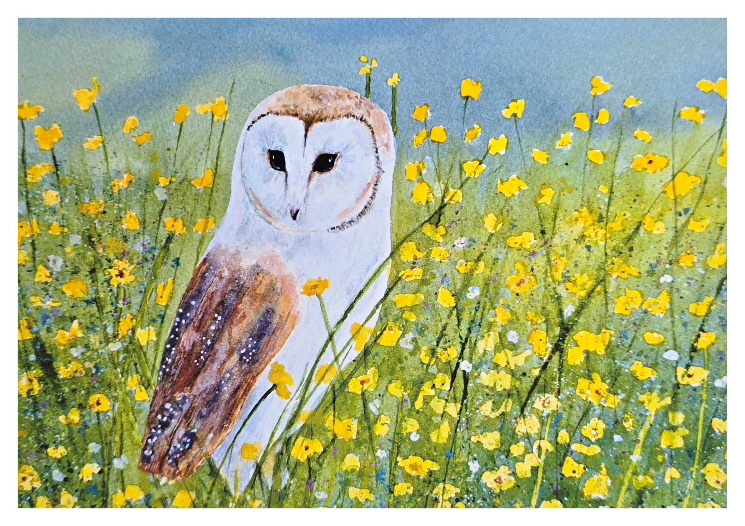 This very majestic owl sits proudly amongst the buttercups surveying his area. The colours in this image are quite magical and it complements the subject well with the owl and buttercups.