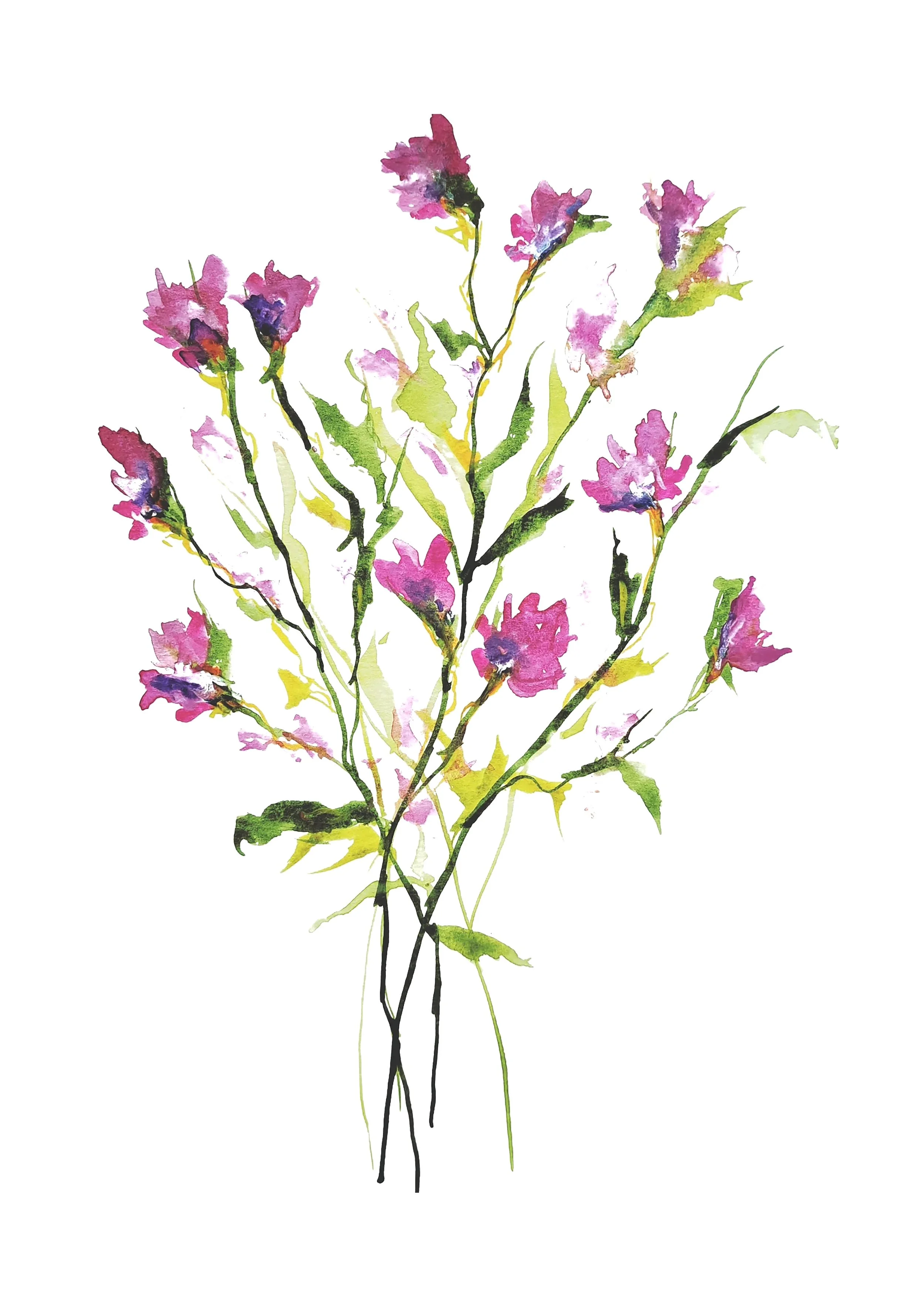 A super loose effect of pretty purple flowers, against a pure white background, just naturally flows with movement. This print would make a great art statement in most rooms.